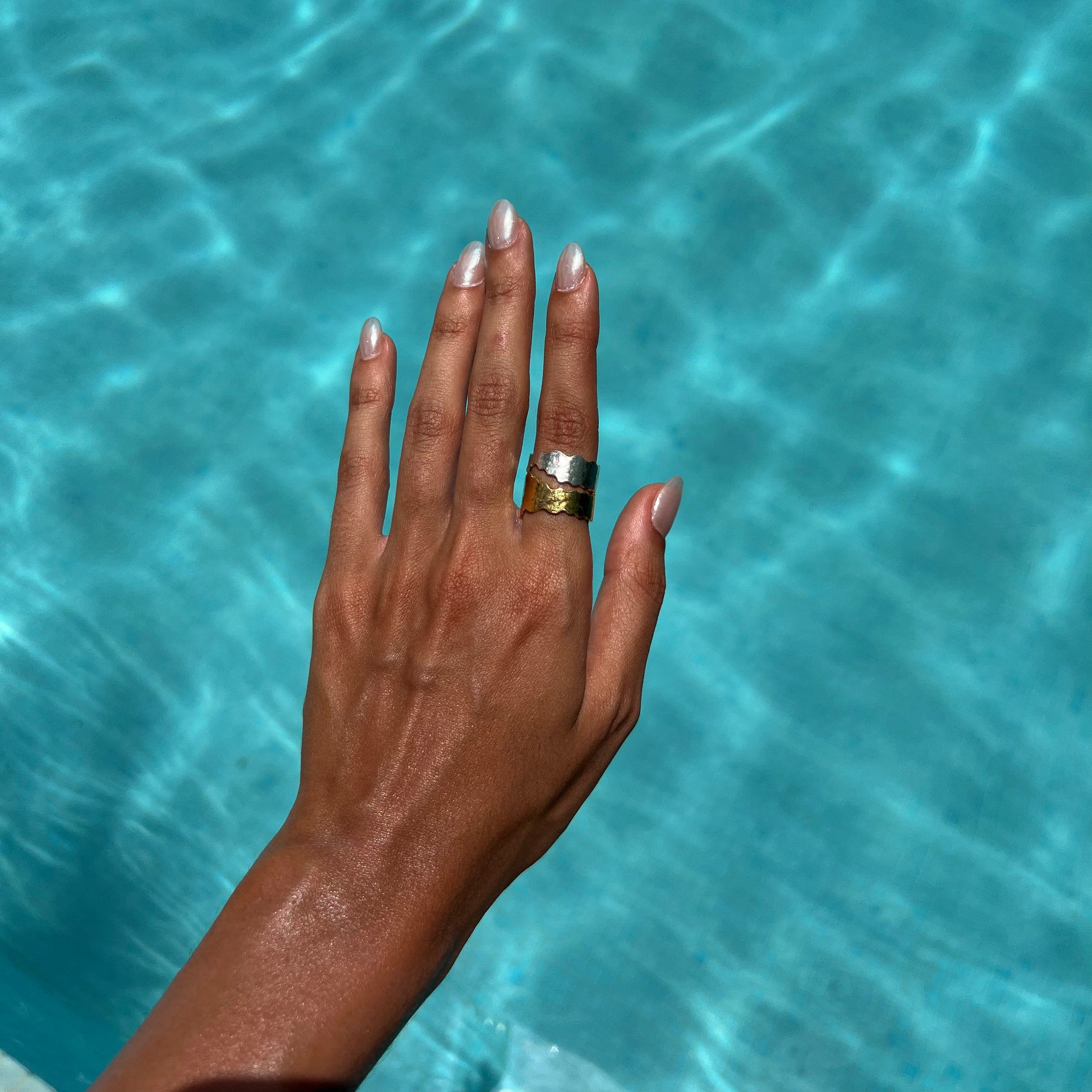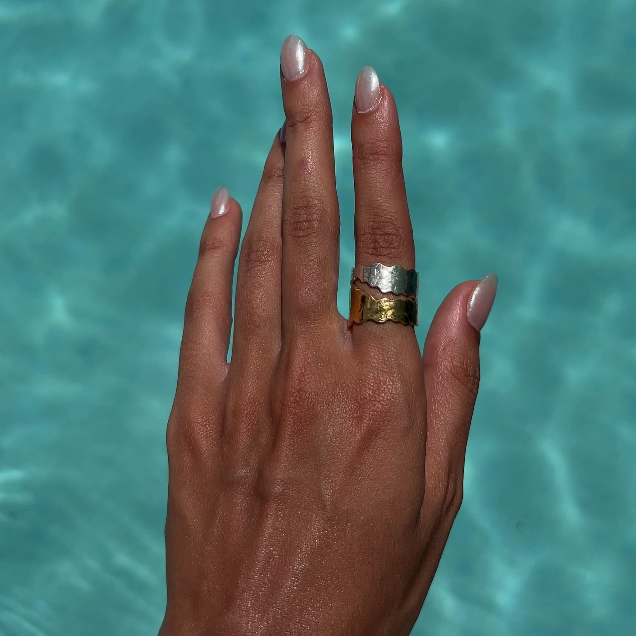 Anillo de dos piezas con un diseño cortado a mano, creando un efecto desgarrado único. Disponible en oro+oro, oro+plata y plata+plata.