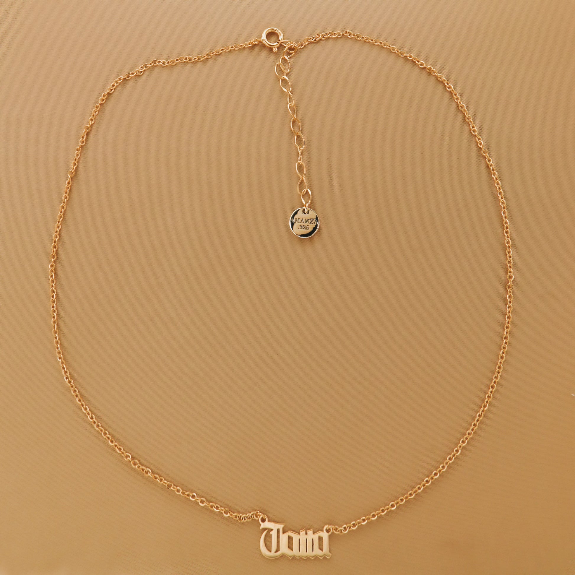 Cadena delicada con un dije personalizable con tu nombre en fuente gótica. Cadena: 40 cm + 5 cm extensible. Dije: 0.6 cm x 1 cm.