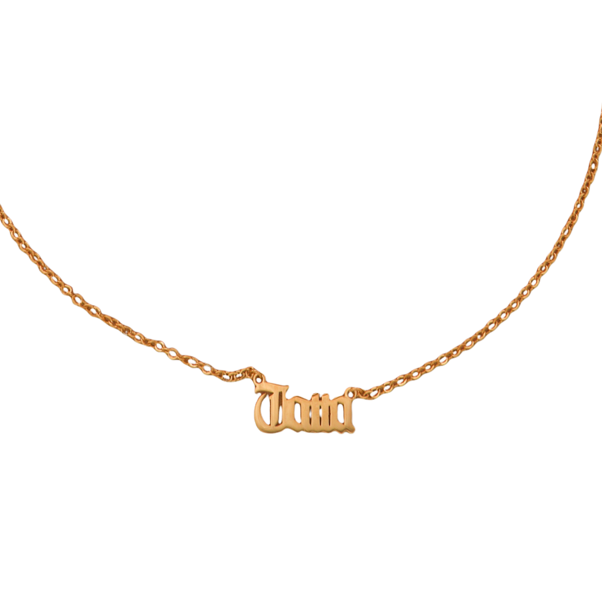 A dainty chain with a customizable charm – add your name in gothic font. Chain: 40 cm + 5 cm extensible. Charm: 0.6 cm x 1 cm.